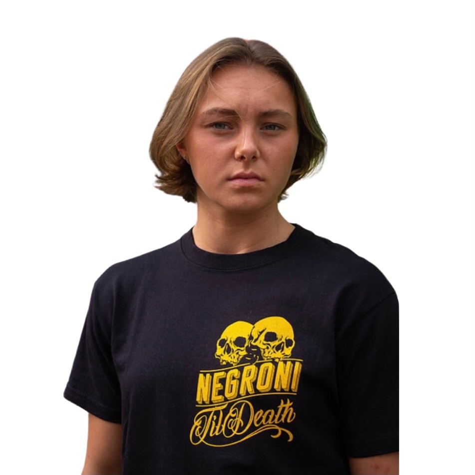 Featuring "Negroni Till Death" on the front, with Old Poison artwork on the back.